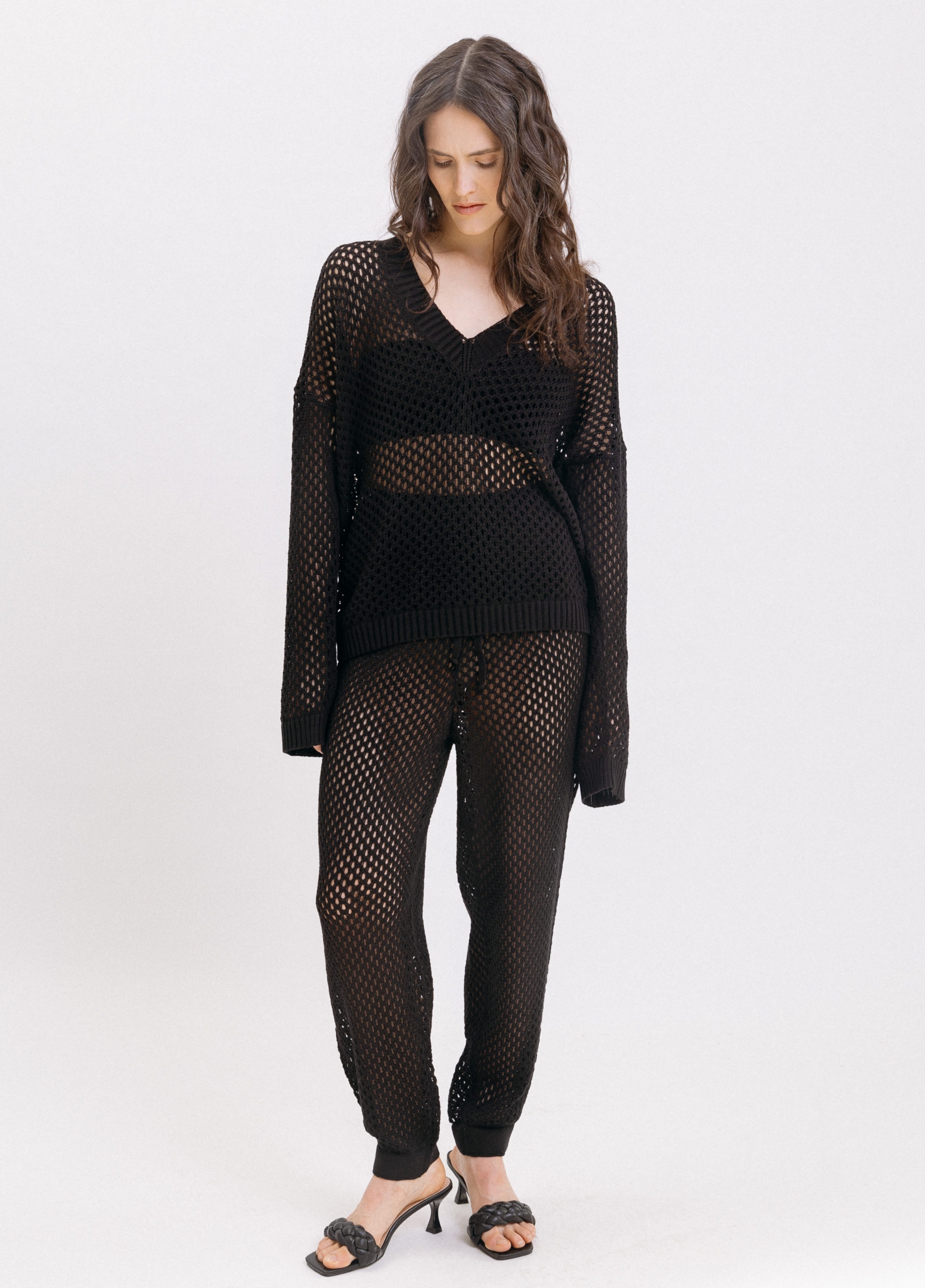 Сетчатое платье комфортного кроя в длине макси. Изделие создано с укороченной длиной рукава. Воротник О-образный. Манжеты, низ и воротник обработаны однотонными полосами в мелкий рубчик.