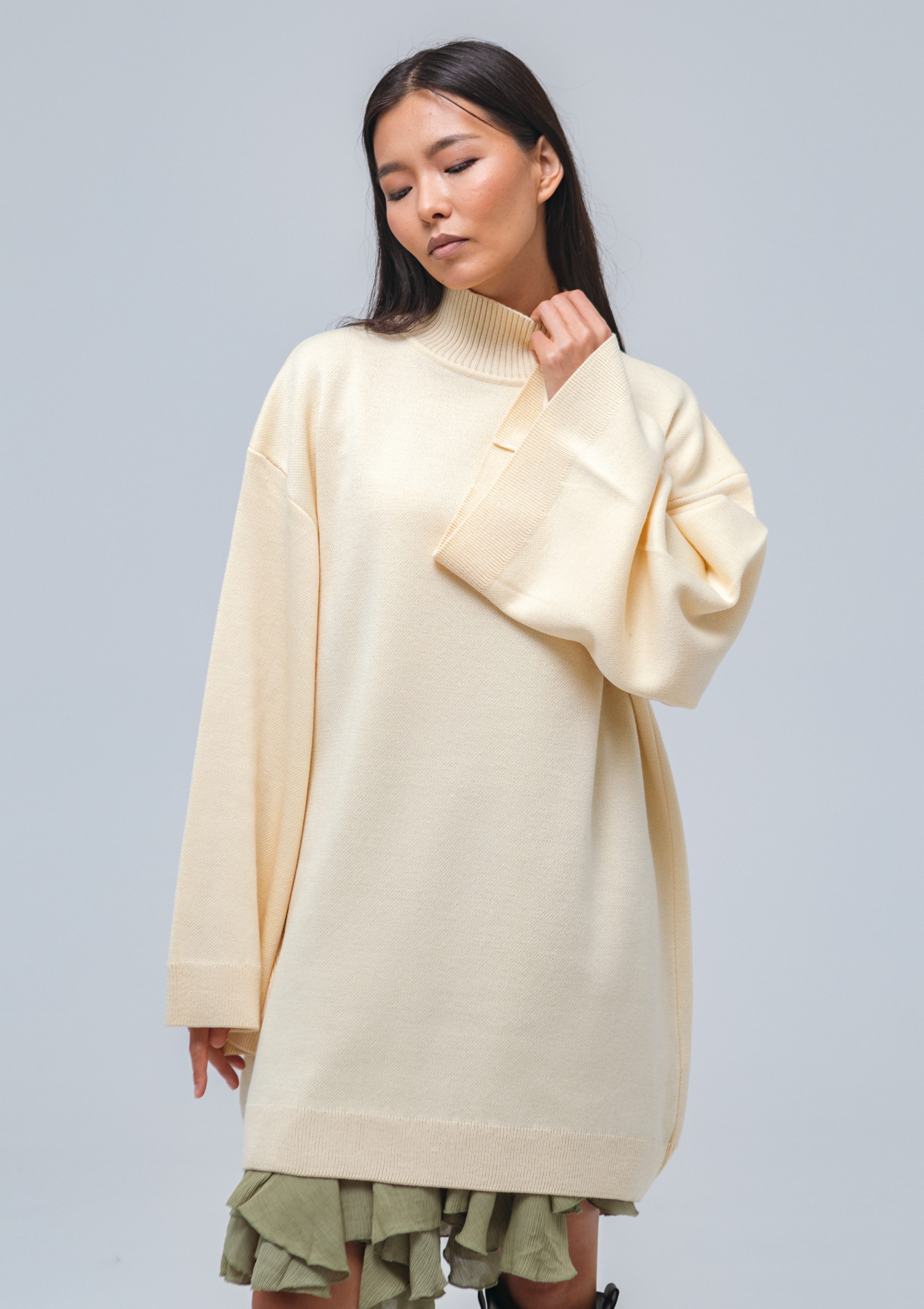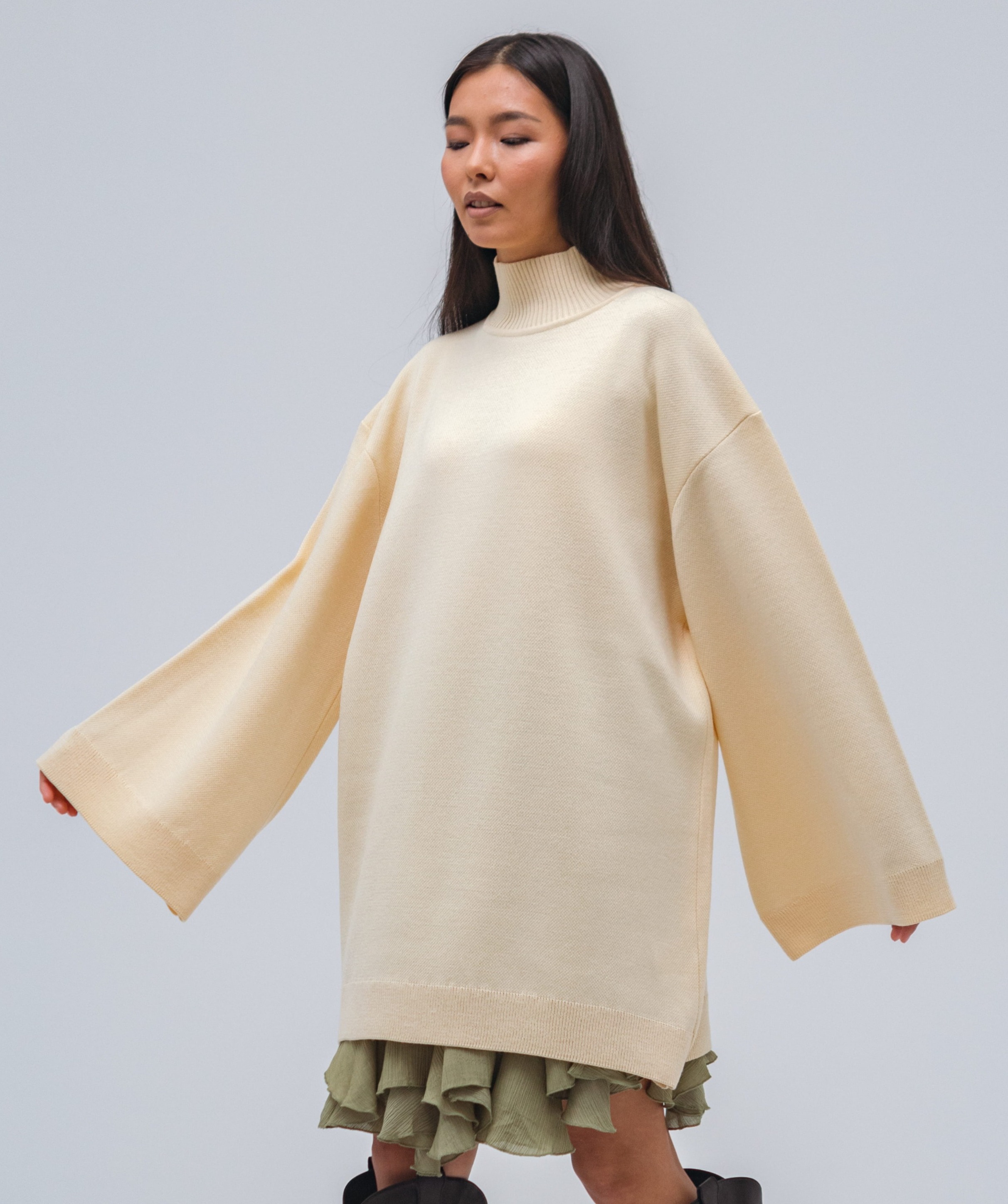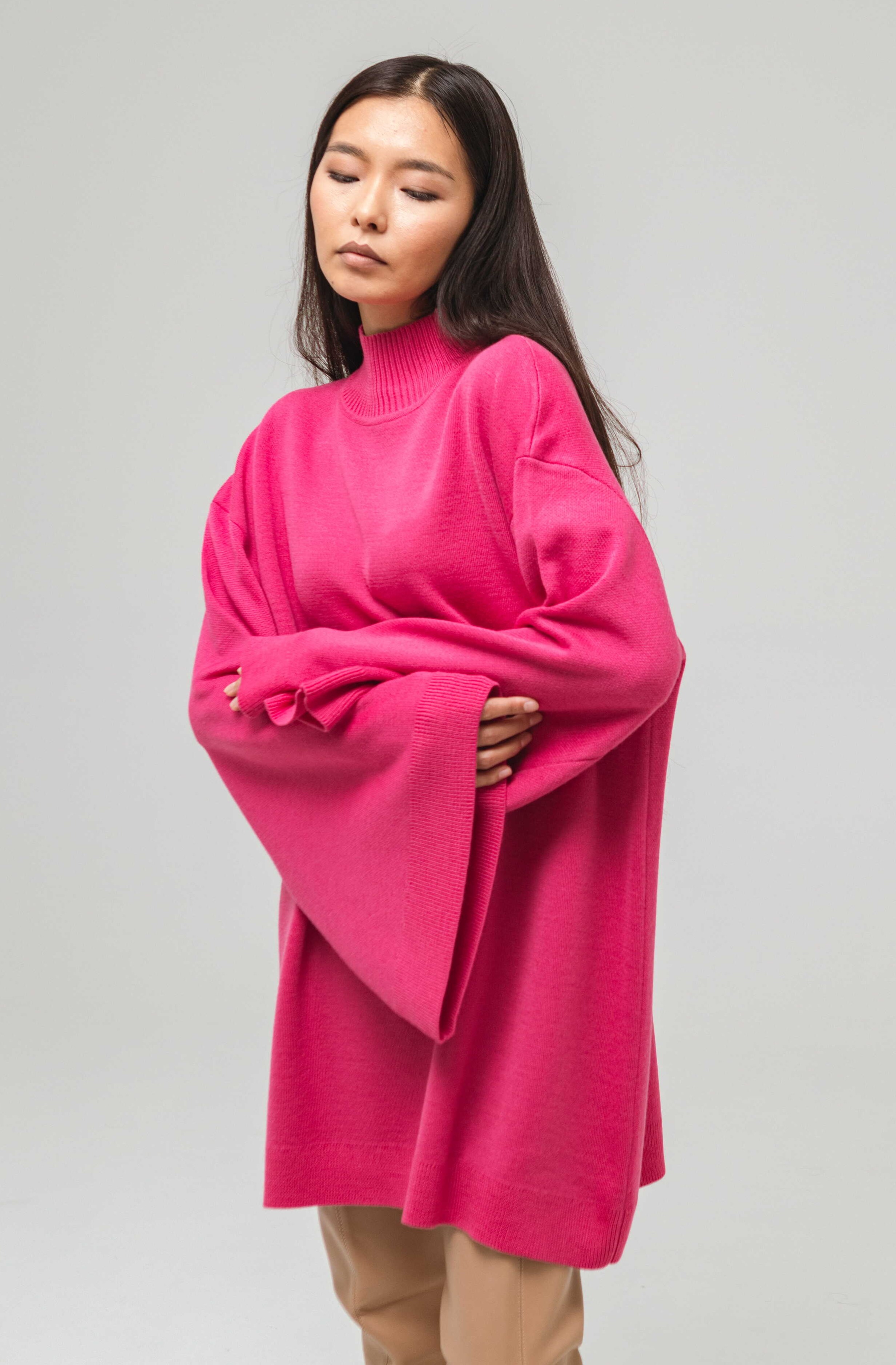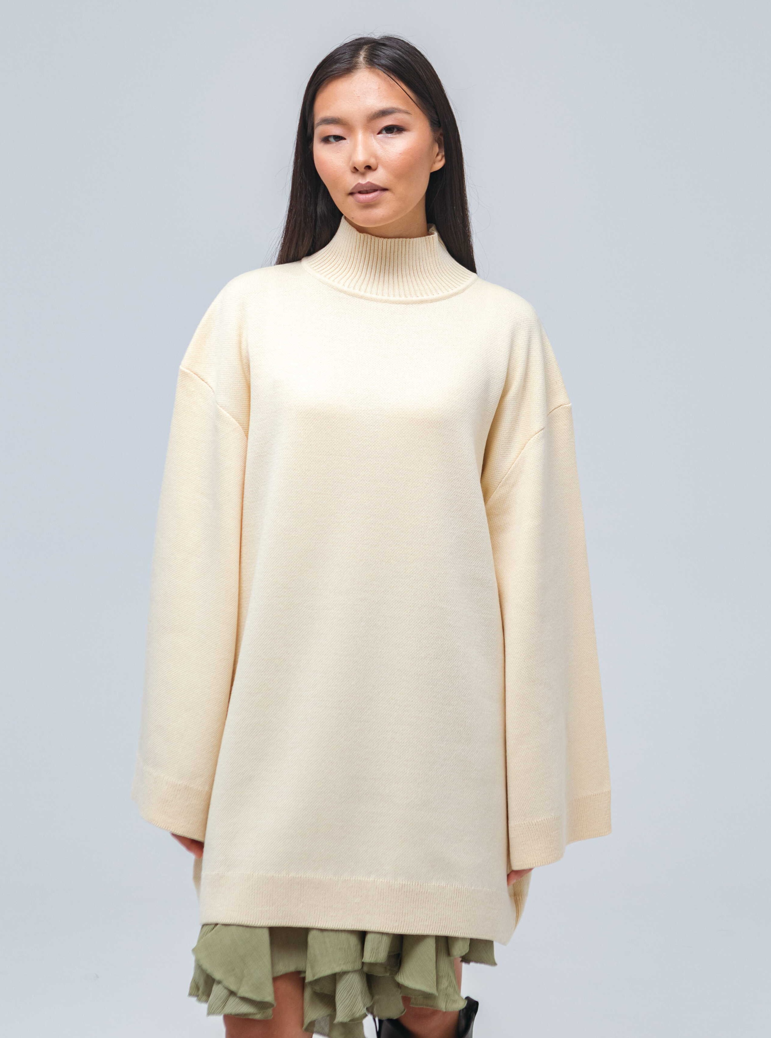 Свитер-платье гладкой вязки прямого кроя с широкими рукавами. Изделие выполнено с заниженной линией плеч. Свитер дополнен воротником умеренной ширины и манжетами. Крой рукавов расширяется от линии плеч к области кистей.