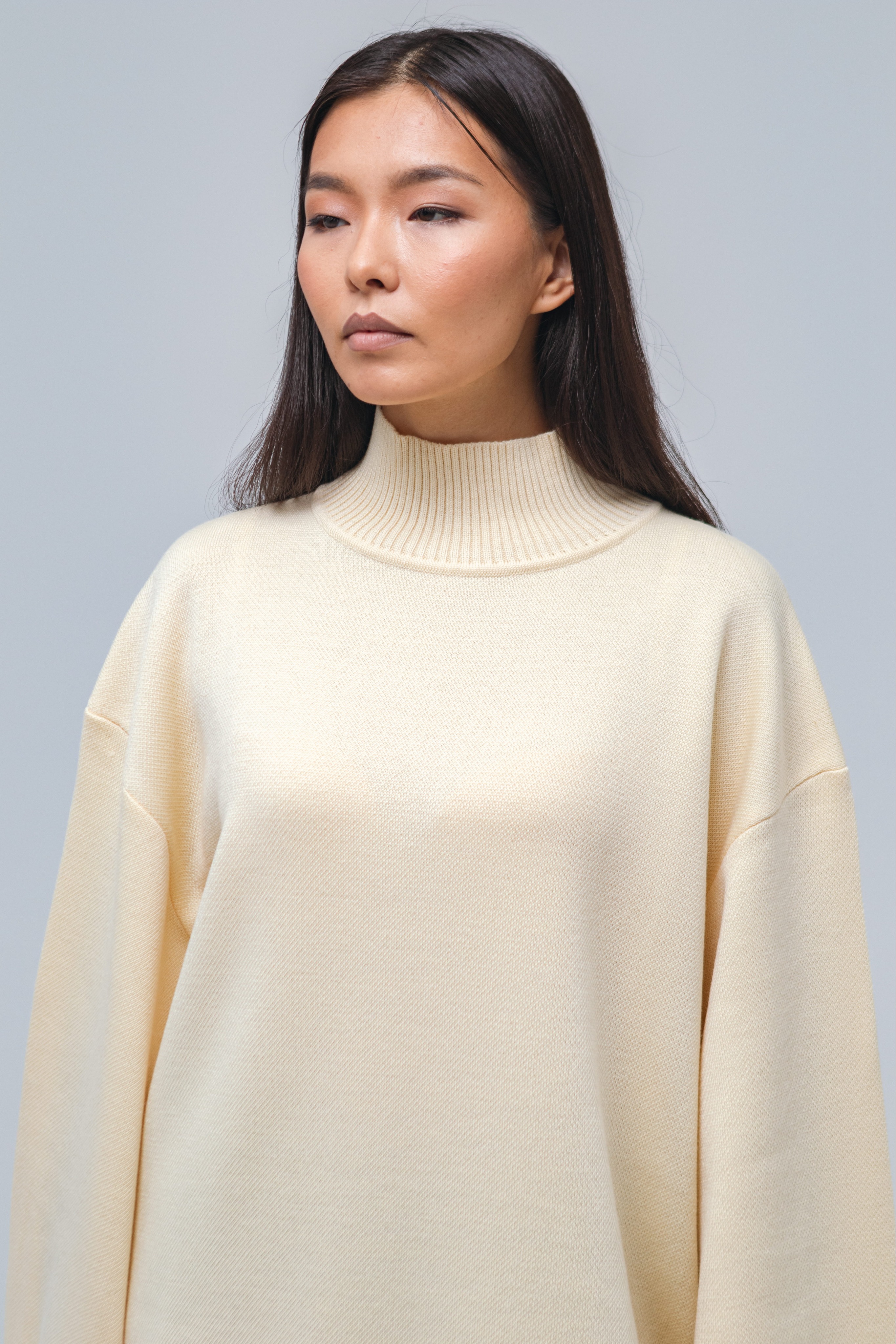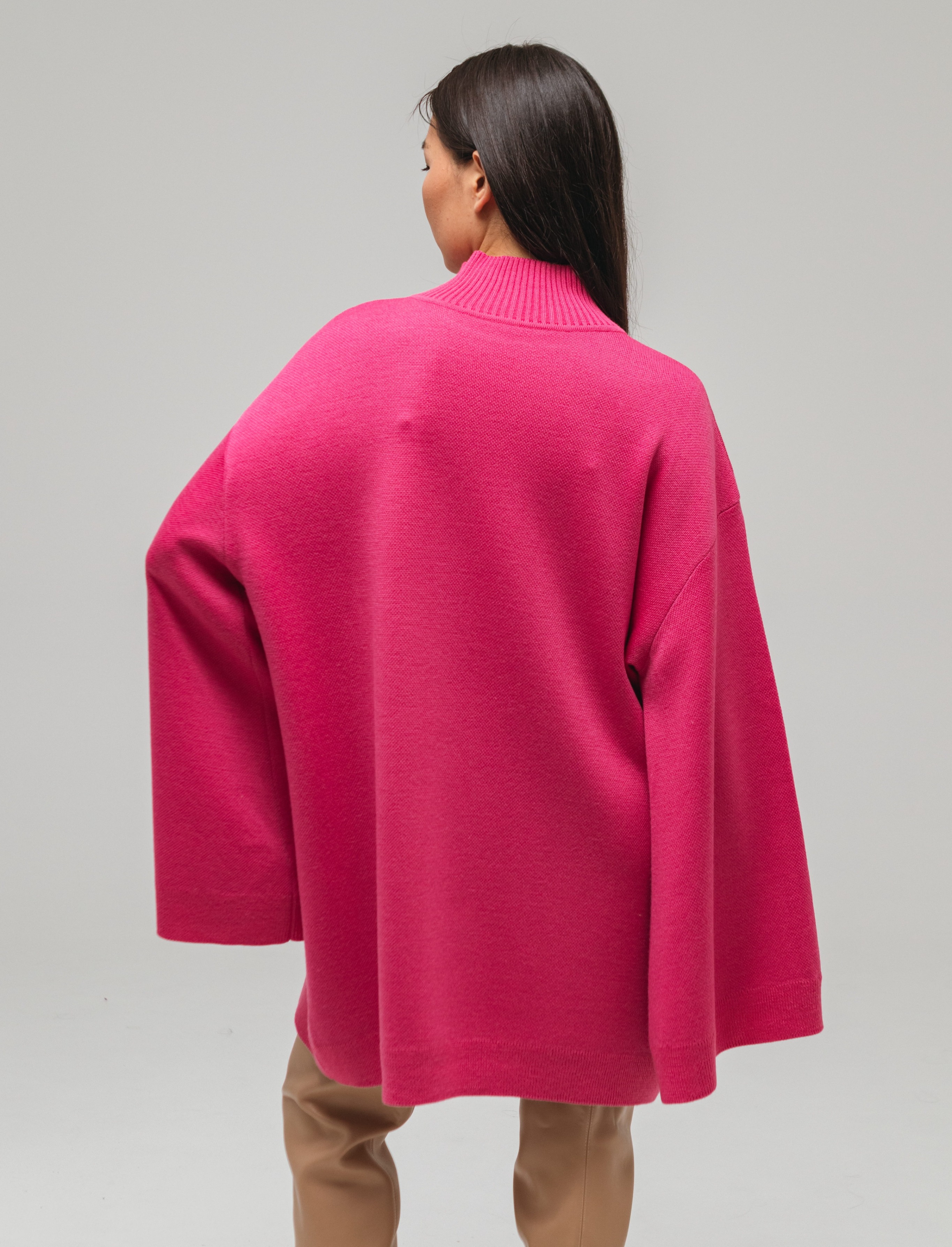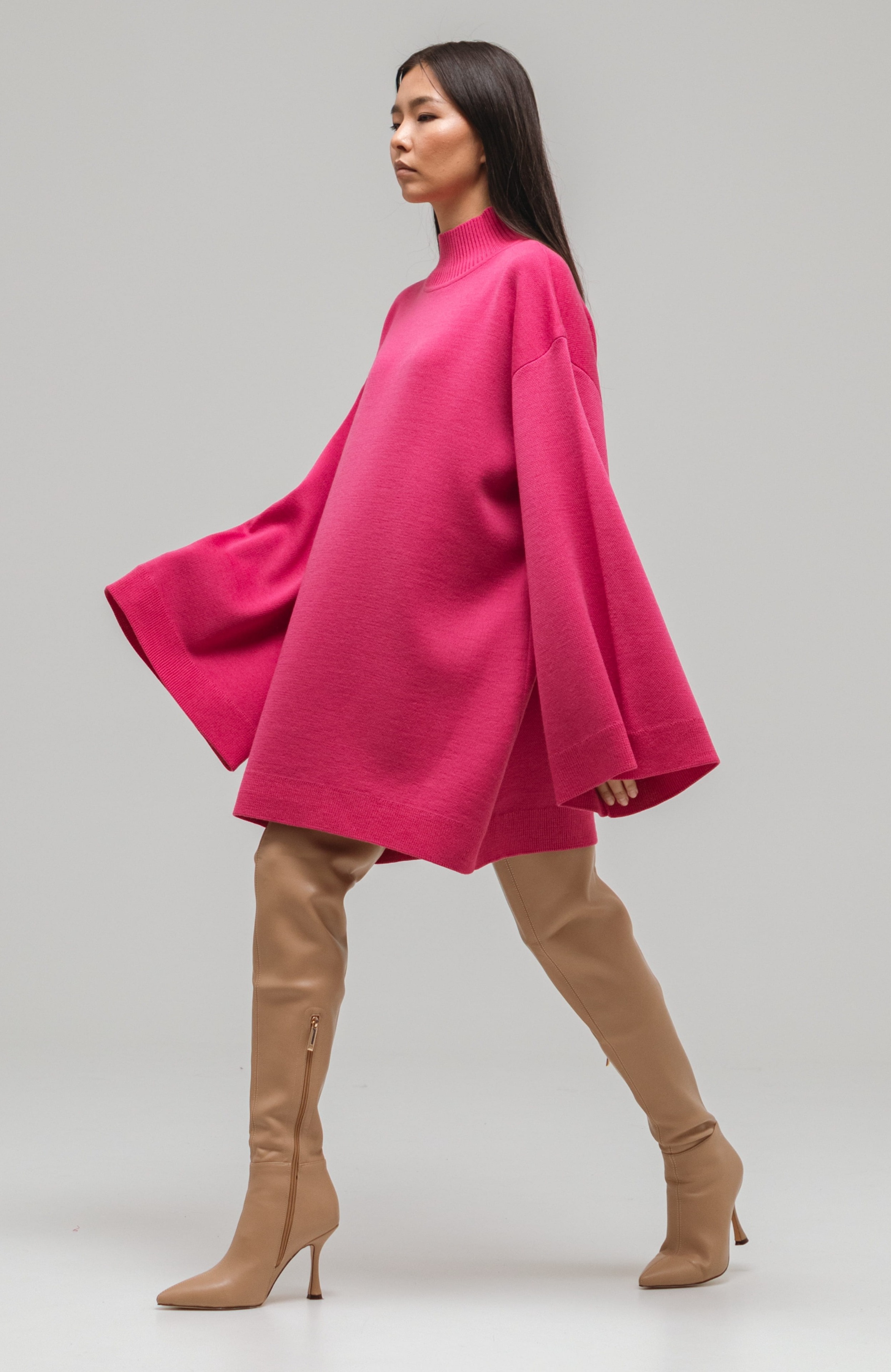 Свитер-платье гладкой вязки прямого кроя с широкими рукавами. Изделие выполнено с заниженной линией плеч. Свитер дополнен воротником умеренной ширины и манжетами. Крой рукавов расширяется от линии плеч к области кистей.