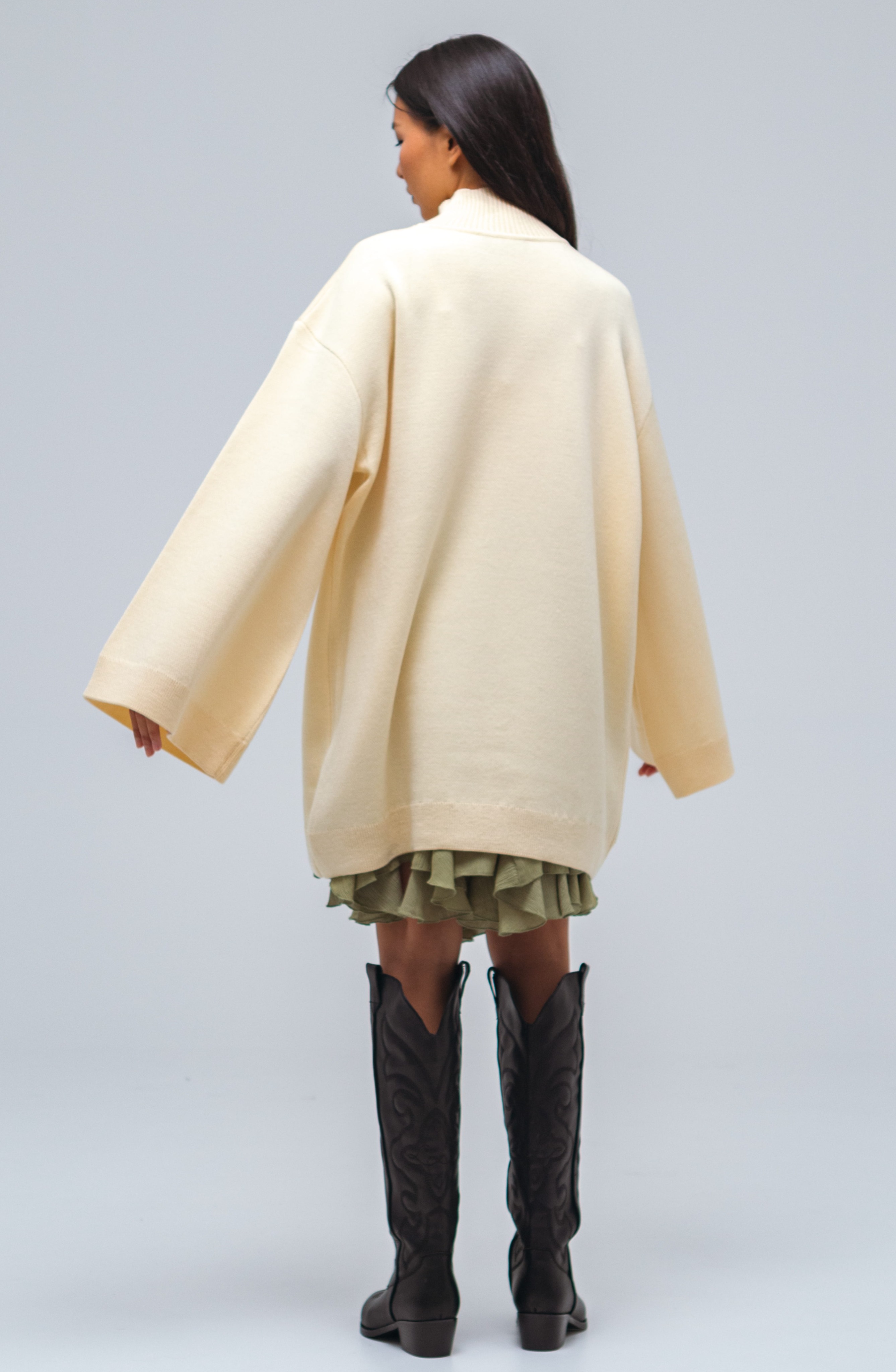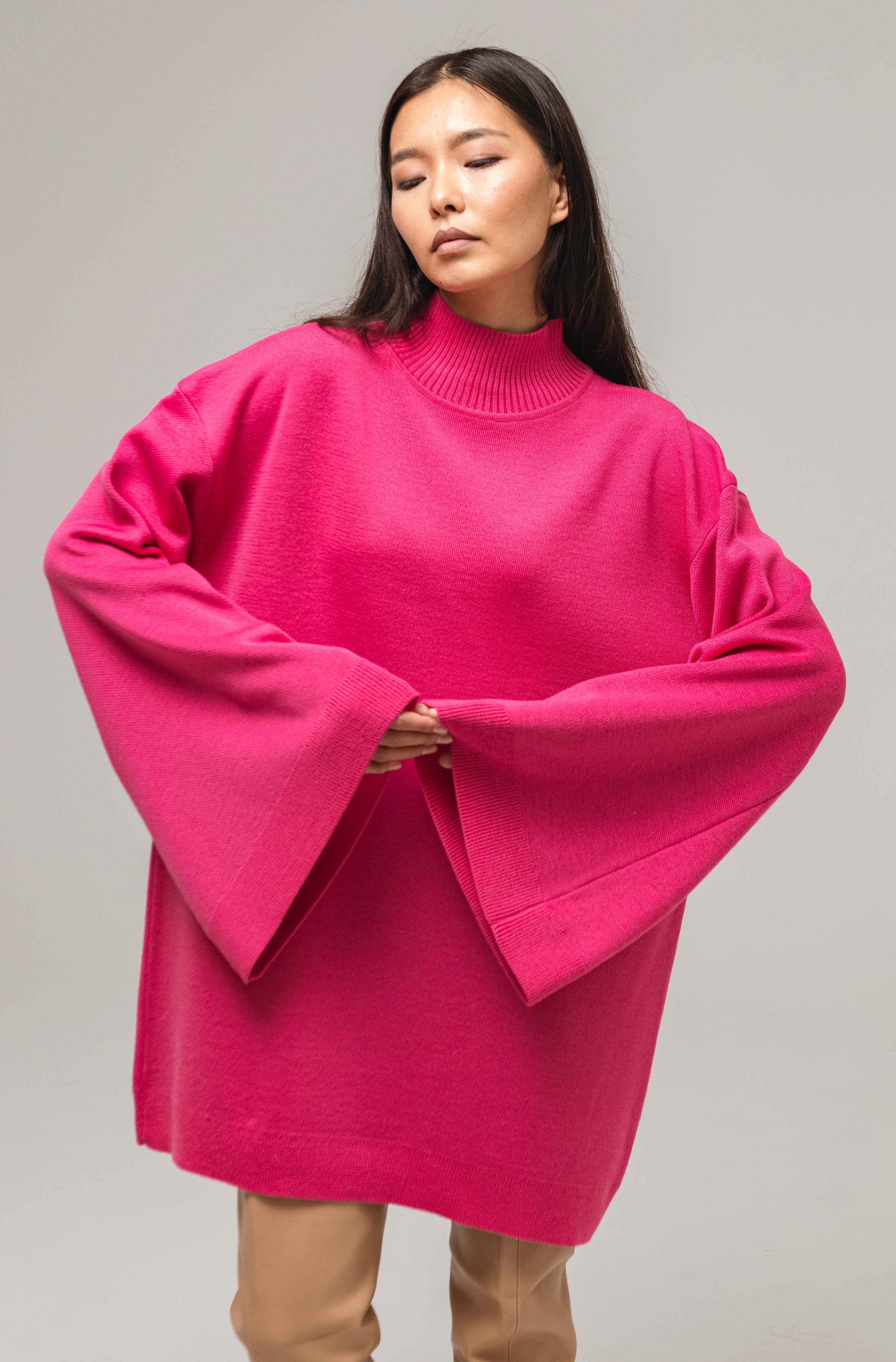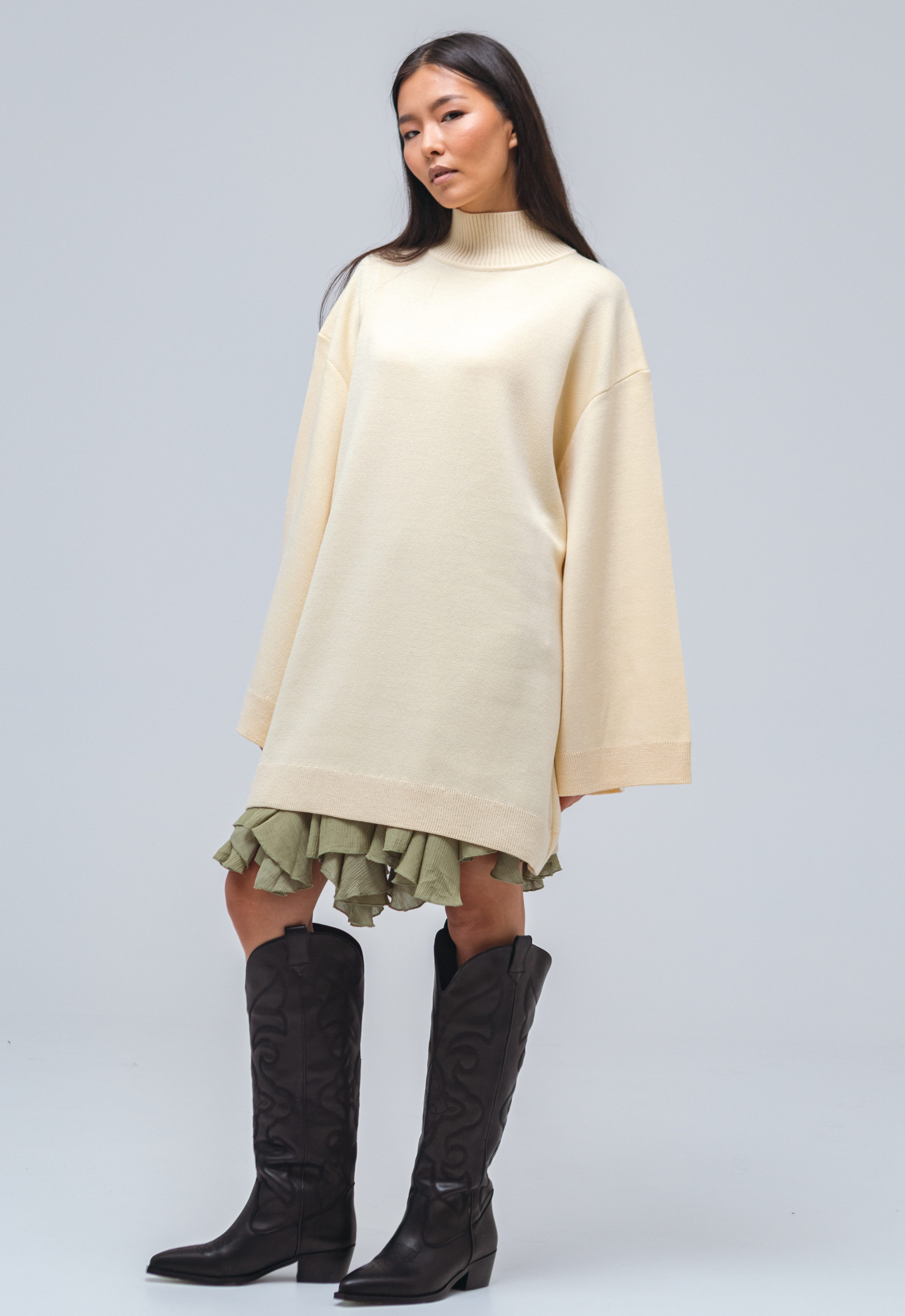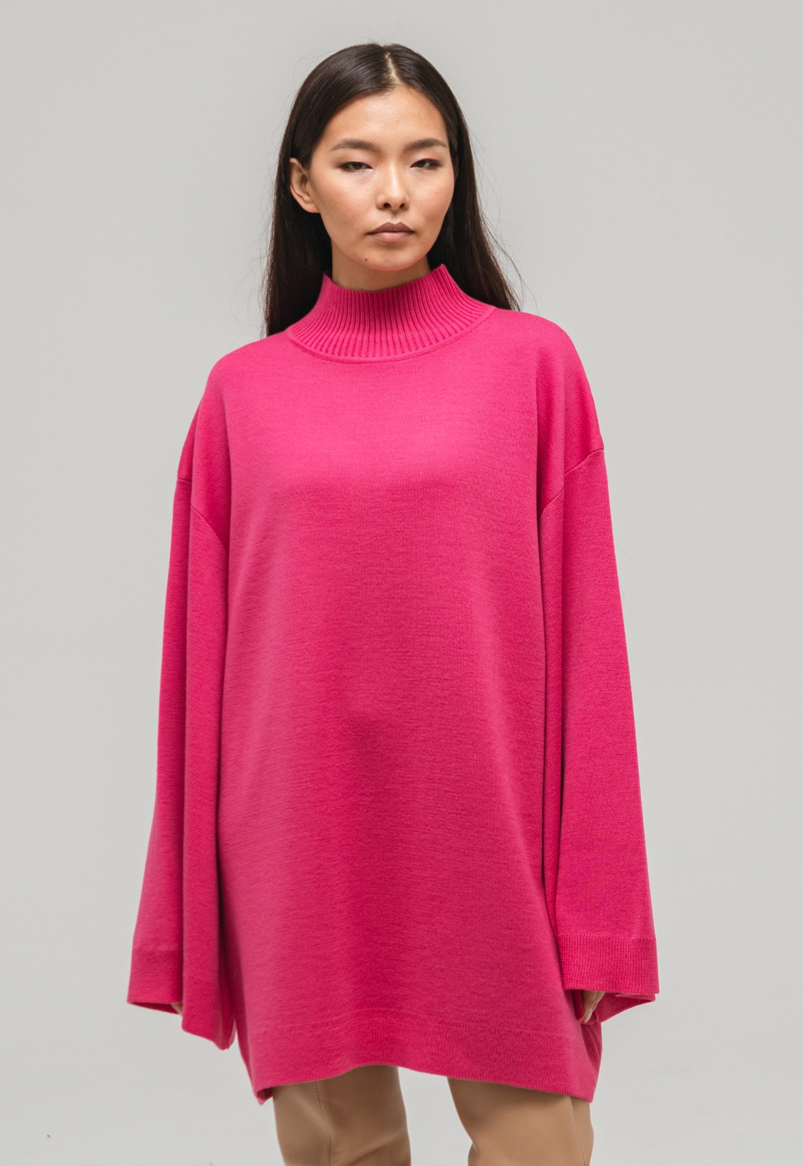 Свитер-платье гладкой вязки прямого кроя с широкими рукавами. Изделие выполнено с заниженной линией плеч. Свитер дополнен воротником умеренной ширины и манжетами. Крой рукавов расширяется от линии плеч к области кистей.